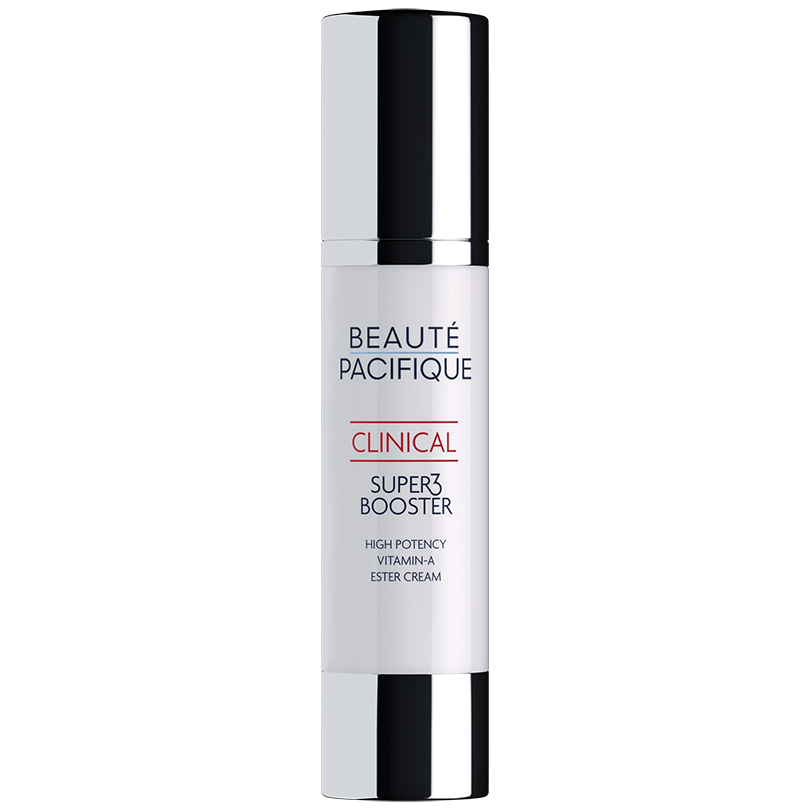 Clinical Super3 Booster er en meget stærk og meget hudvenlig Vitamin A creme, der effektivt forebygger og reparerer svære aldersforandringer, markante solskader, uren hud med øget sebum udskillelse samt tynd og skrøbelig hud. Clinical Super3 Booster gendanner tabt collagen-struktur i hele hudens tykkelse og forstærker overhudens struktur, så fine linjer og rynker mindskes og huden bliver mere robust og modstandsdygtig overfor ydre påvirkninger. Produktet indeholder tre sebum-refulerende ingredienser, som stabiliserer og normaliserer hudens produktion af fedtstof.