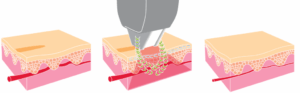 Ljósið og hitin frá lasaranum trongir niður til húðina við hjálp av einum serligur geléi, ið tryggjar samband millum húð og laser. Ljósið frá lasaranum verður upptikið av litinum av kørinum ið hitast upp og blóðkørini vera niðurbrotin.