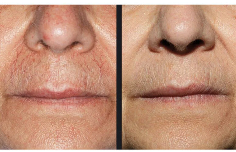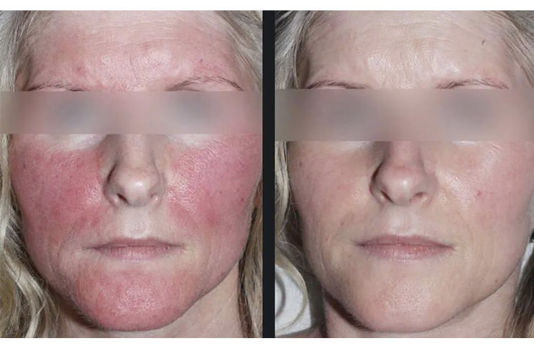 IPL er sera gott til at minka um tað reyða í húðini, taka sjónlig blóðkør burtur, trekkja lit úr arrum í eru reyðlig, brúnlig ella lilla. IPL til Rosacea kann minka um tað reyða og dempa inflammatiónina.