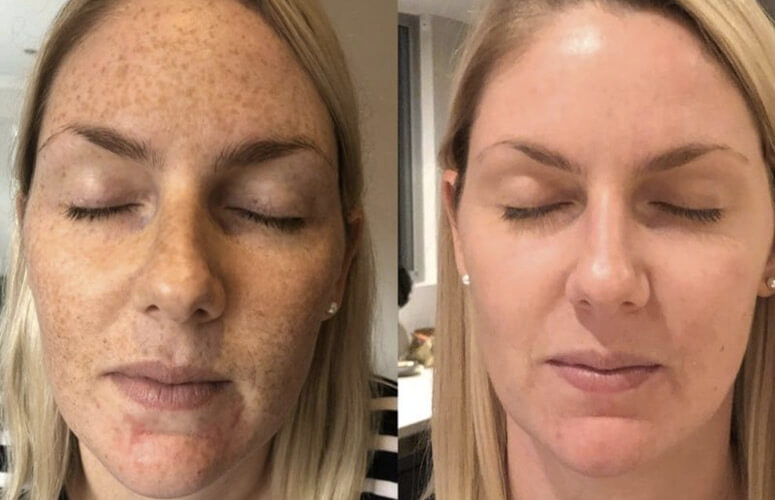Úrslit Hjá 99% hvørva pigmentplettarnir, og gevur betringar uppá 85%. Longu 7-10 dagar aftaná byrjan av Cosmelan viðgerðini, sæst sjónligur munur. Plettarnir minka, og húðin blívur meira eins og endurnýggja. Aftaná umleið 7-8 vikur (eitt sindur longri fyri myrka húð) er úrslitið maximalt. Plettarnir minka og húðin far náttúrliga glóð. Sum eyka, minkar Cosmelan um tolg og feittframeleiðsluna og minkar um sjónligar porur. Cosmelan er ein sera djúpt virkandi viðgerð, tí kunnu tað koma turr og viðkvom økir á húðina, sum tó skjótt blíva betur.