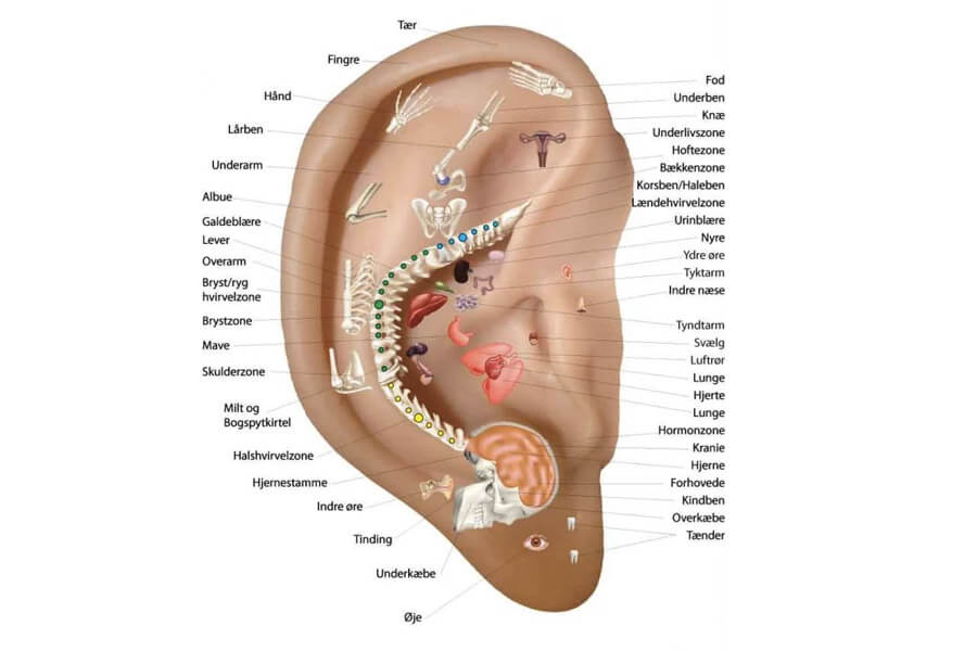 Akupunktur í oyra er sera gott til akutta og kroniska pínu. Í oyranum er allur kroppurin deildur upp í ávís økir, tískil kann oyrnaakupunktur stórtsæð hjálpa uppá allar kropsligar og sálarligar óbalansur. Oyrnaakupunktur verður ofta viðmælt til pínu framum vanligan kropsakupunktur.