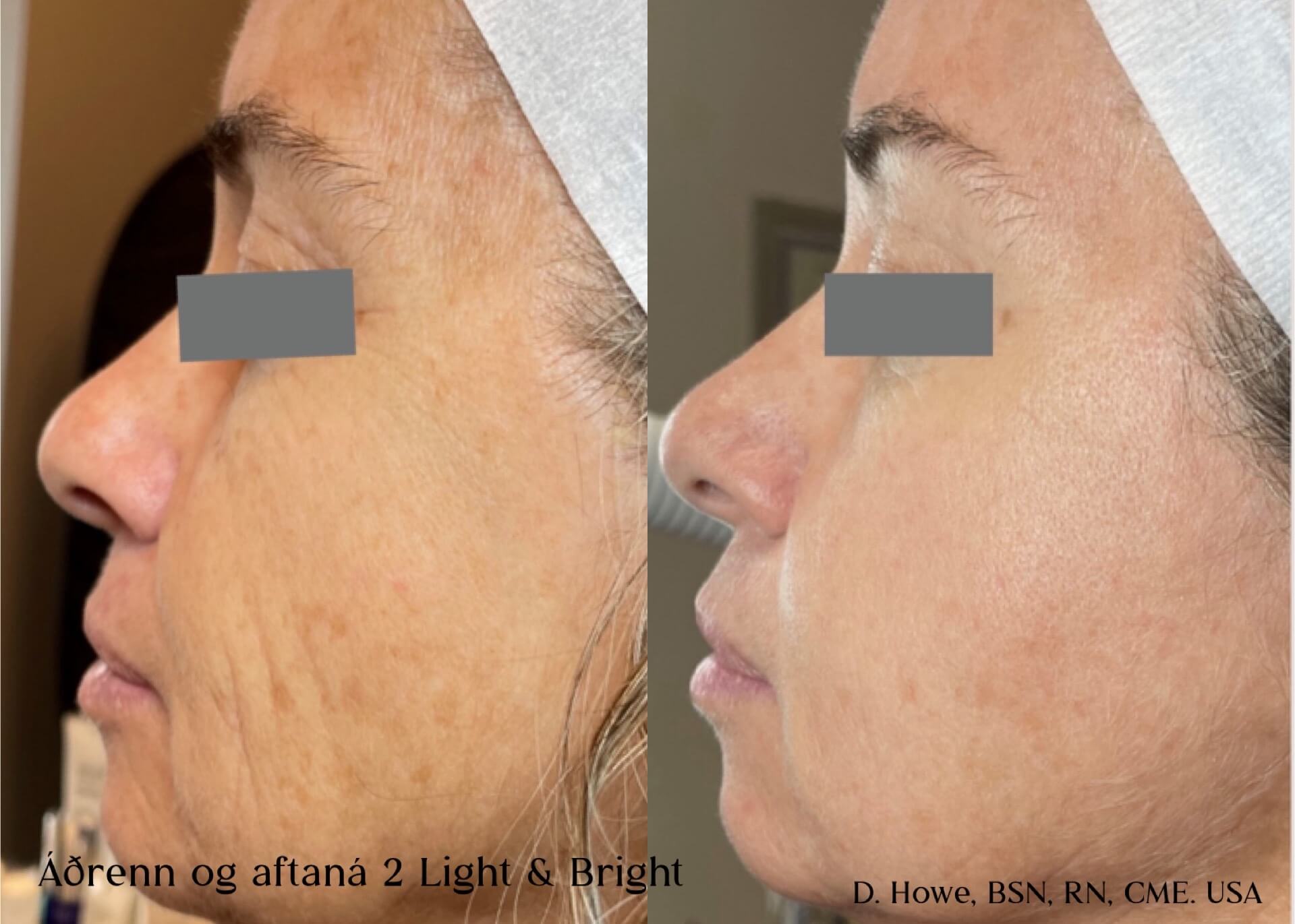 Light & Bright er nýggj framkomin viðgerð, ið einans fæst við Nordlys® frá Candela. Viðgerðin sameinir tvær nýmótans tøknir: Tí sera vældámdu IPL/ SWT® og Frax 1550, ið báðar saman geva enn betri úrslit. IPL arbeiðir í yvirhúðini og Frax 1550 í undirhúðini – hetta uttan at skaða húðflatuna.